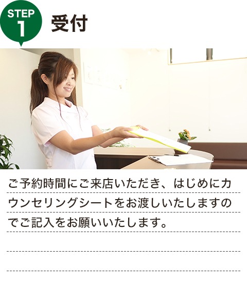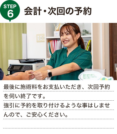 担当制ですので、いつも同じ施術者が対応いたします。