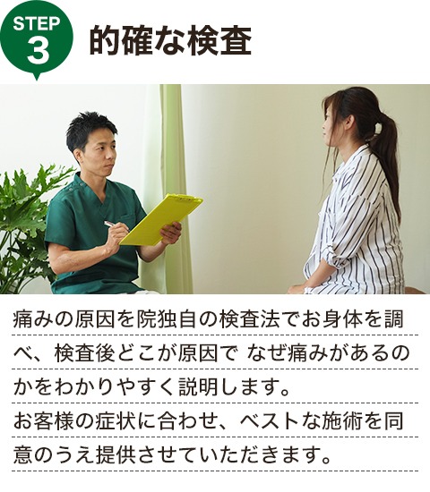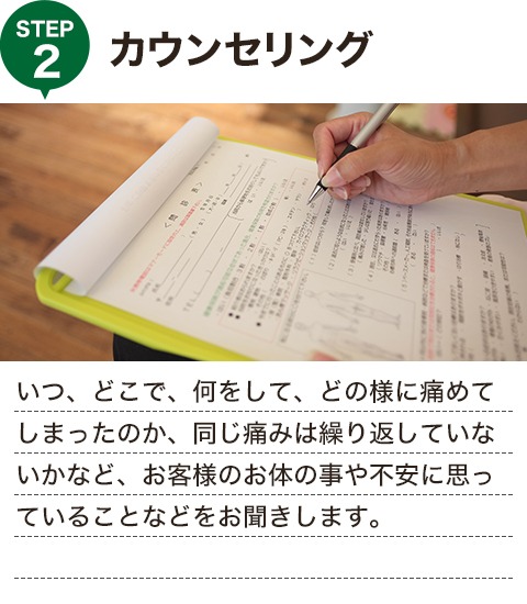 カウンセリングと全身検査によって今起きている症状、その原因を探り、良くなっていくための的確な施術を行っていきます。