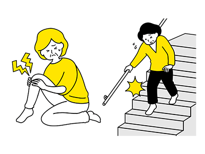 膝がガクガクしたり、歩行中に不安定に感じることが多くなります。膝が支えきれずに不安定になるため、転倒のリスクが高まります。