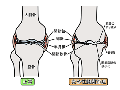 変形性膝関節症は、膝関節を構成する軟骨が摩耗して、関節の動きがスムーズでなくなる病気です。