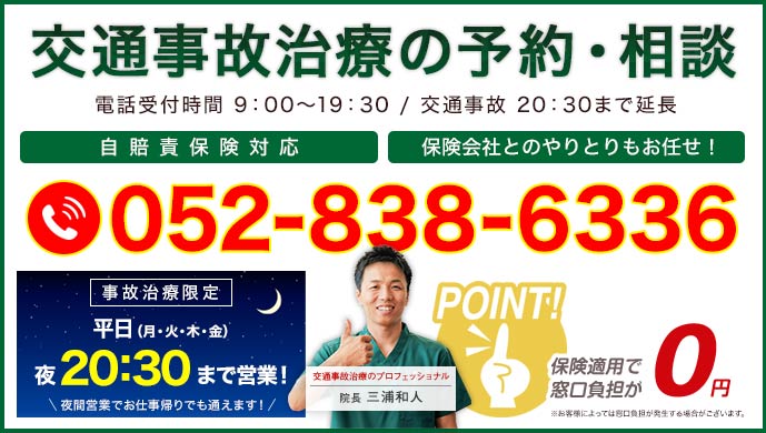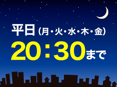 通常は平日19:30までの営業時間としておりますが、交通事故施術の方のみ限定で「平日20:30まで」受付をしております。