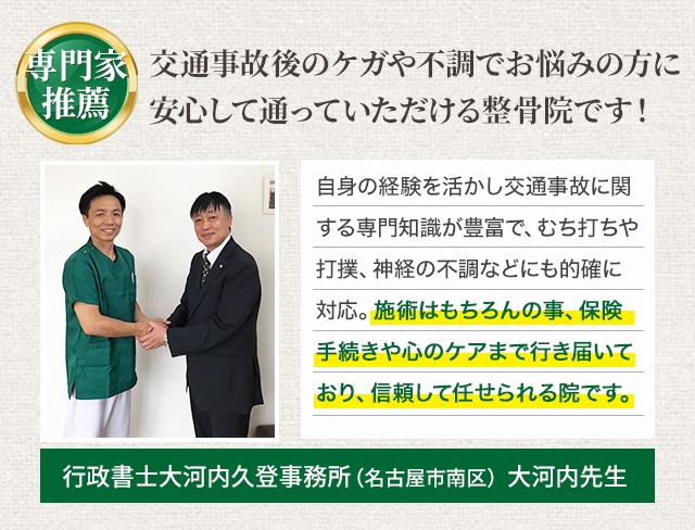 当店は不運にも交通事故に遭ってしまったあなたのお身体を根本から改善し、得られるべき補償を受け取って頂けるよう全力で対応いたします!!