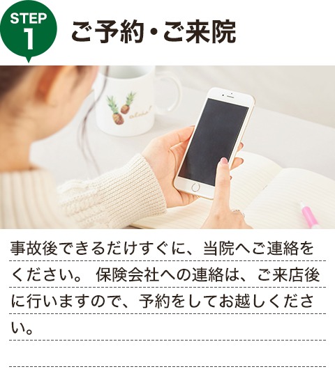 まずは、交通事故に遭ったらすぐに当院へご連絡ください。