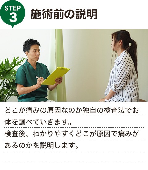 カウンセリングと全身検査によって今起きている症状、その原因を探り、良くなっていくための的確な施術を行っていきます。