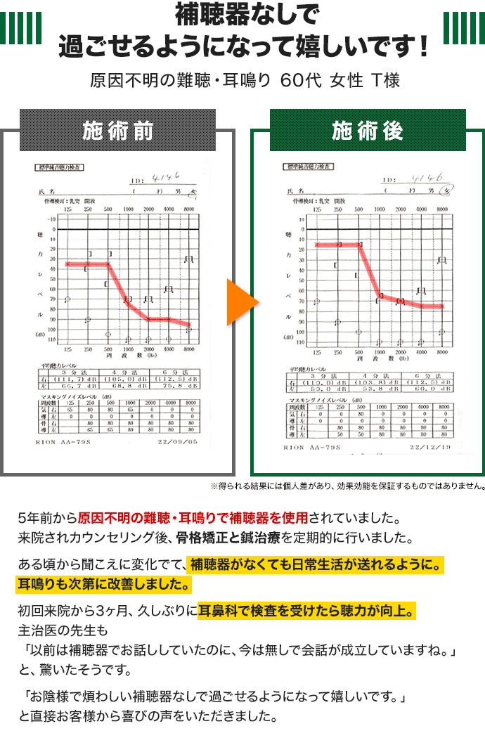 耳の症状に変化は見られなかったが、全身の骨格のバランスが整ってくると同時に首肩の緊張が緩和してきた。